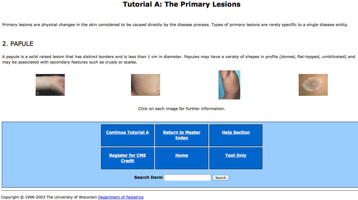 Dermatology site put together by The Univ of Wisconsin-Madison with tutorials and excellent descriptions of macules/papules/etc. I love this site because it is SIMPLE - just enough information for me to intelligibly answer my friends' questions about "this strange rash" that just appeared on their stomach - but not enough for me to become a dermatology expert. Perfect.